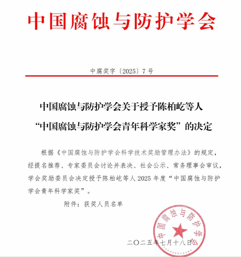 我校陈柏屹教授荣获中国腐蚀与防护学会青年科学家奖