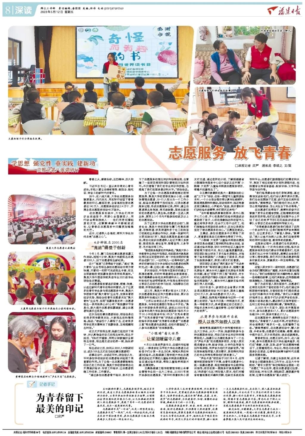 青春有担当,志愿正当时。如今,在八闽大地,参与志愿服务的大学生越来越多,他们在“奉献、友爱、互助、进步”的志愿精神感召下,正朝着规范化、专业化、特色化的志愿服务队伍前进,让青春的脉搏与新时代志愿服务同频共振。