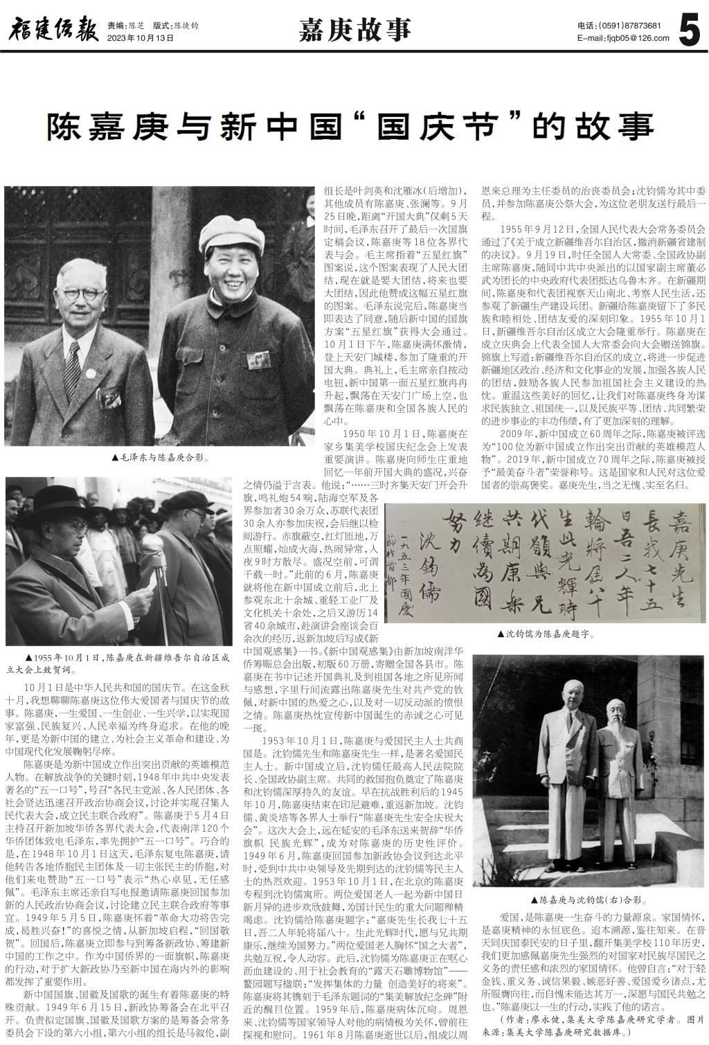 10月1日是中华人民共和国的国庆节。在这金秋十月,我想聊聊陈嘉庚这位伟大爱国者与国庆节的故事。陈嘉庚,一生爱国、一生创业、一生兴学,以实现国家富强、民族复兴、人民幸福为终身追求。在他的晚年,更是为新中国的建立、为社会主义革命和建设、为中国现代化发展鞠躬尽瘁。